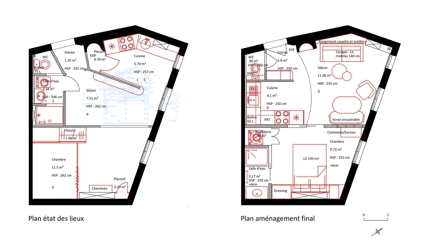 L'aménagement visait à créer un véritable deux-pièces, avec une chambre indépendante dotée de rangements et une salle d'eau attenante . Une buanderie distincte et des WC indépendants seront également intégrés pour répondre aux exigences de confort. La cuisine, quant à elle, s'ouvrira sur le séjour, offrant un espace convivial et fluide.